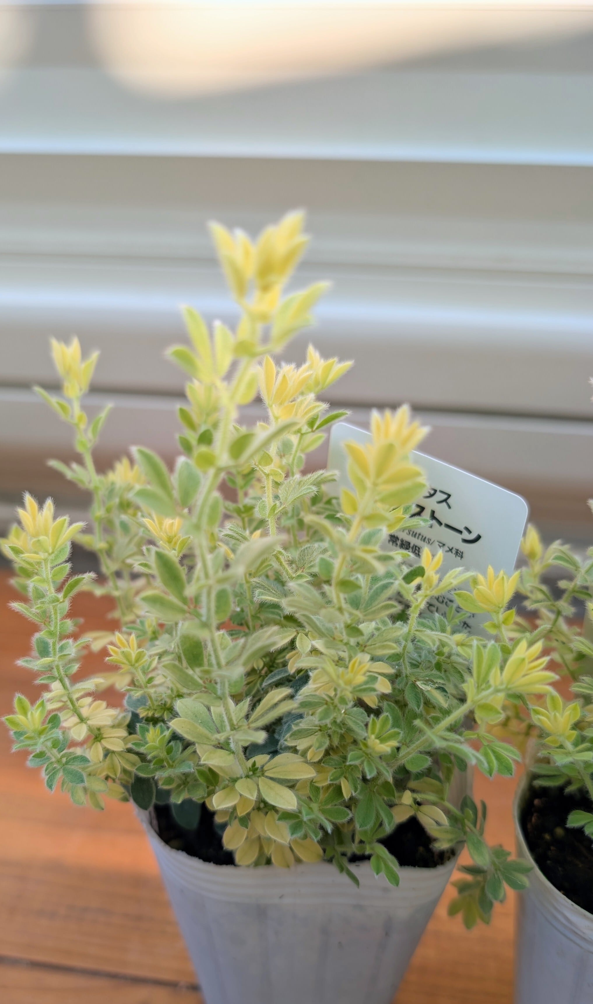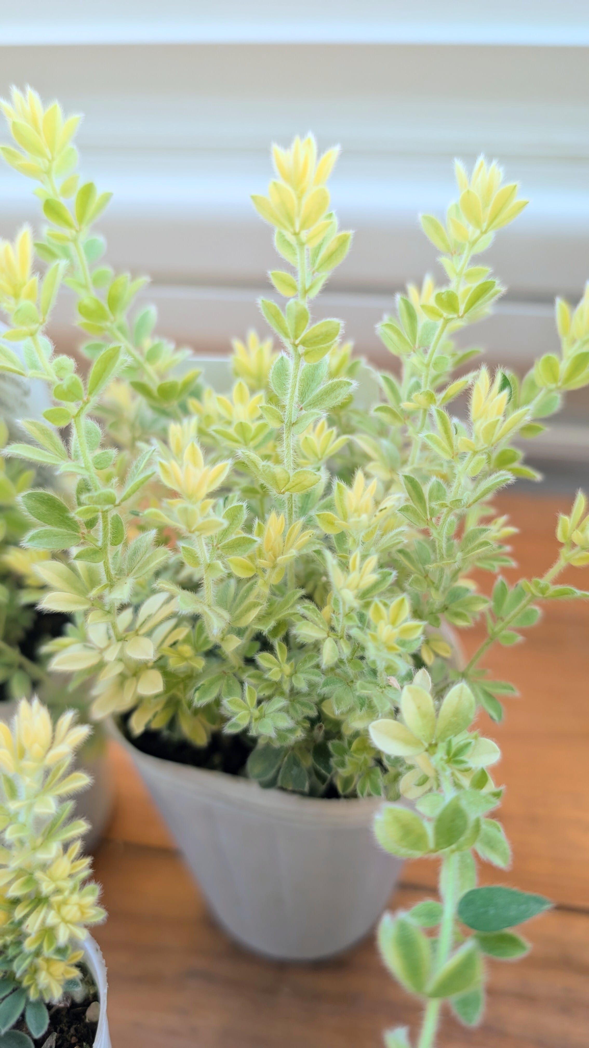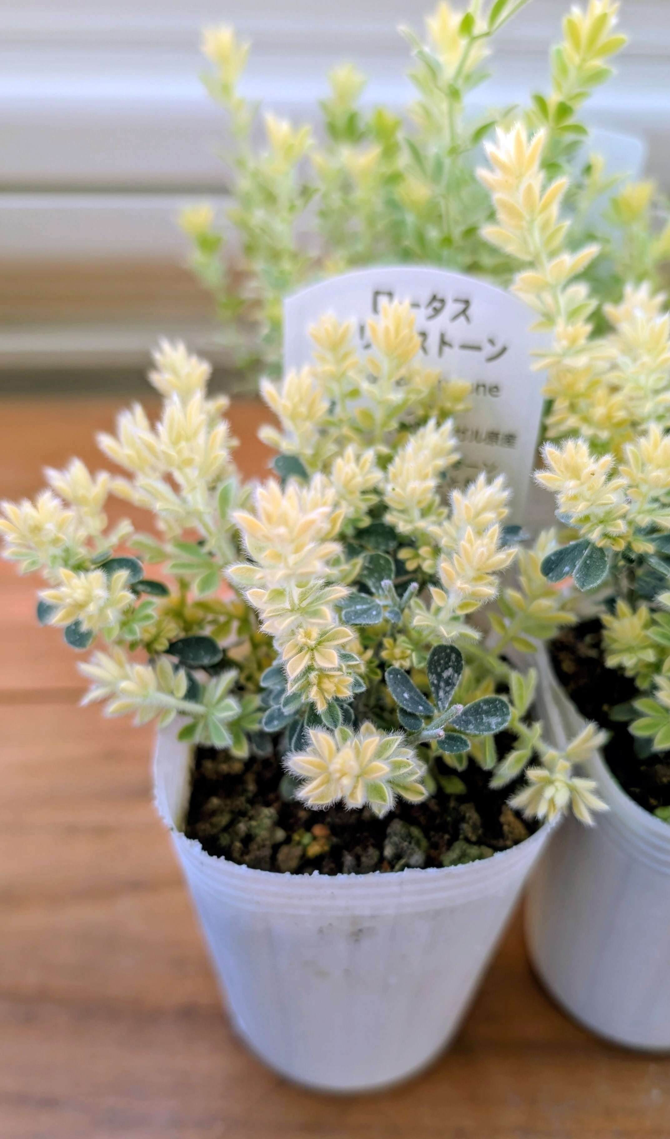 ロータス・ブリムストーンは、シルバーグリーンの葉とクリームイエローの新芽のグラデーションが美しいマメ科の常緑低木です。