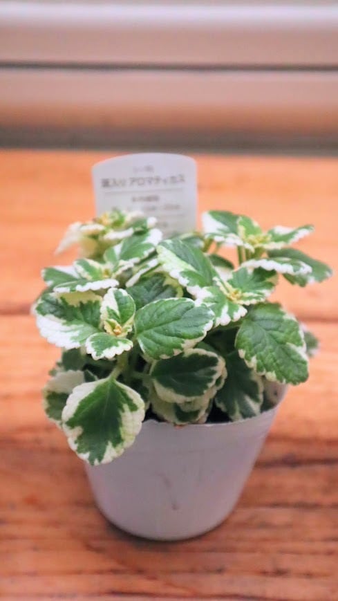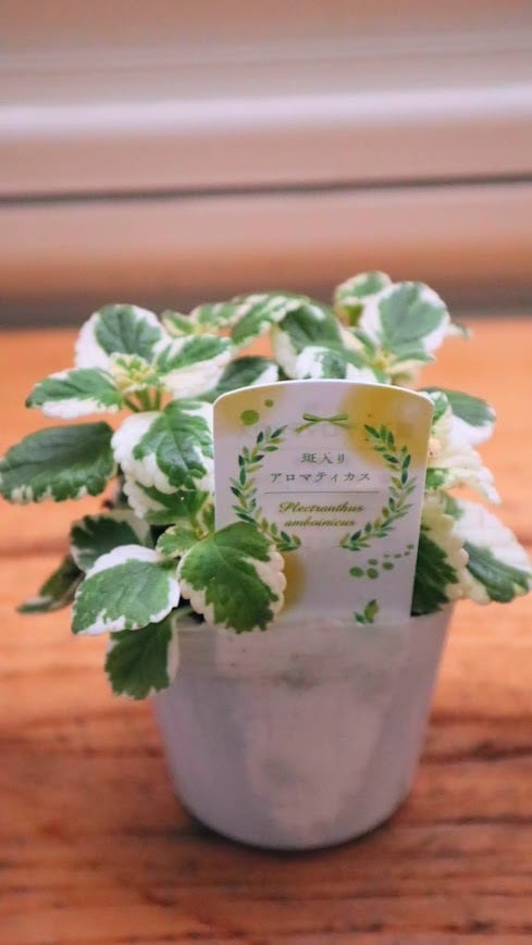 白い斑が入った肉厚の葉。触れると爽やかな香りが広がる。
