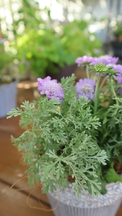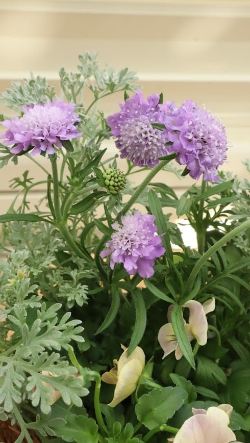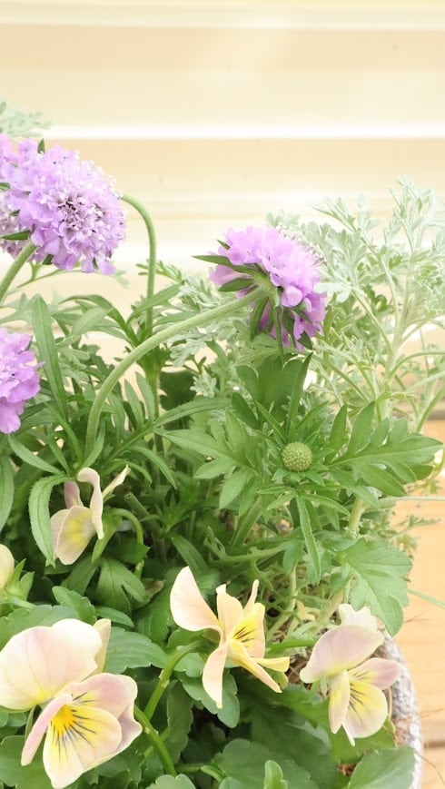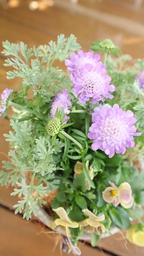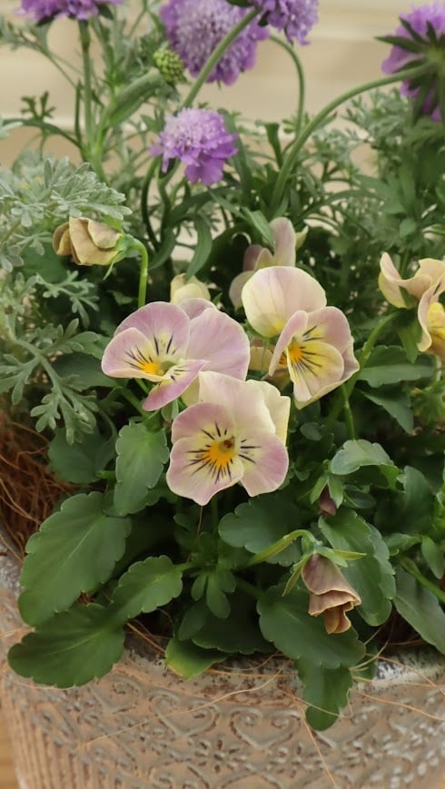 桂楓園さんオリジナルビオラ 万葉菫『おぼろ月』とスカビオサ『Blue Balloon』の寄せ植えです♡