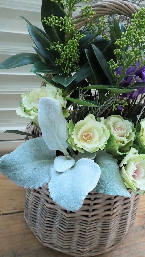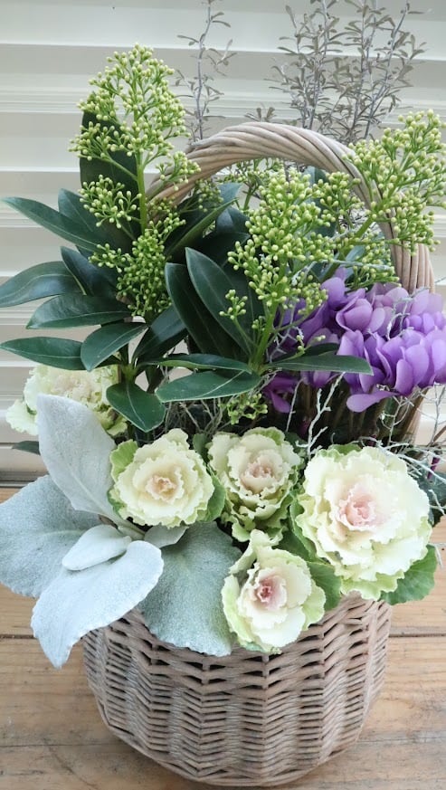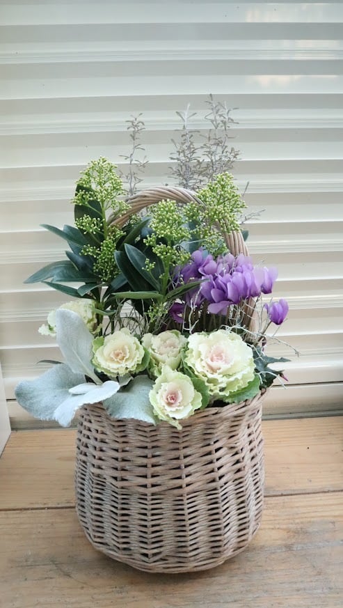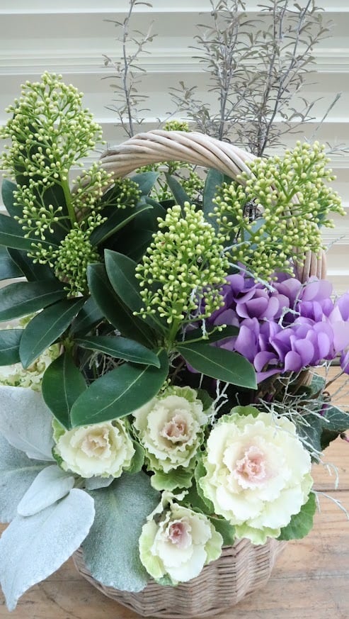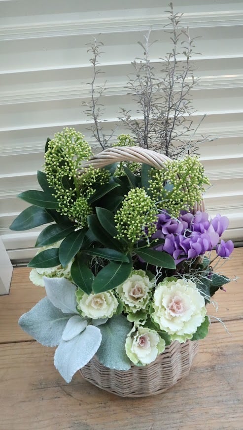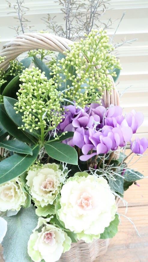 シクラメン『ドラゴン』のライトブルーがスキミアのライムグリーンのつぼみとマッチしていて華やかでかつ爽やかな寄せ植えです。