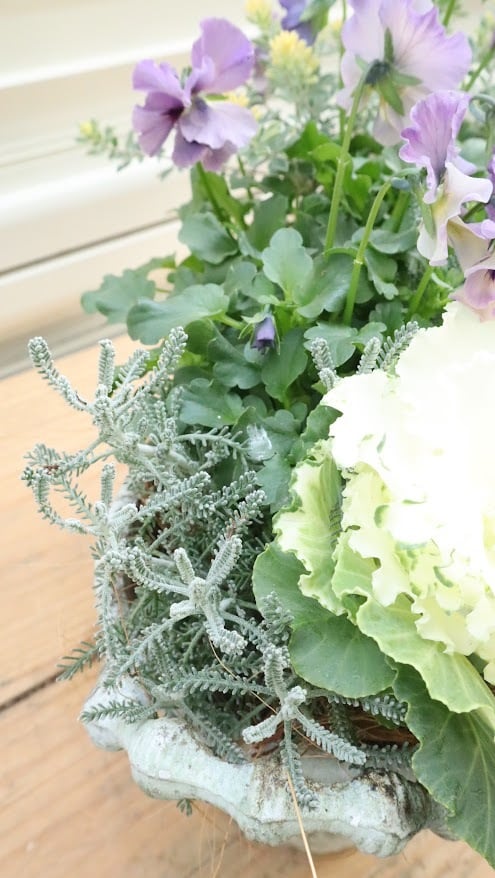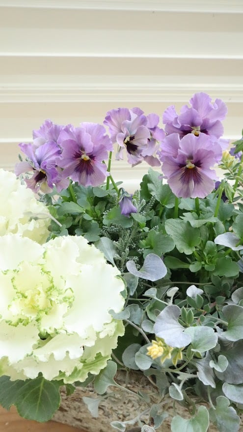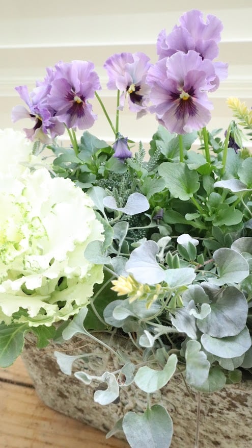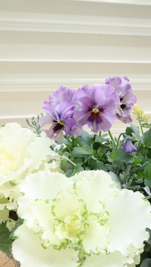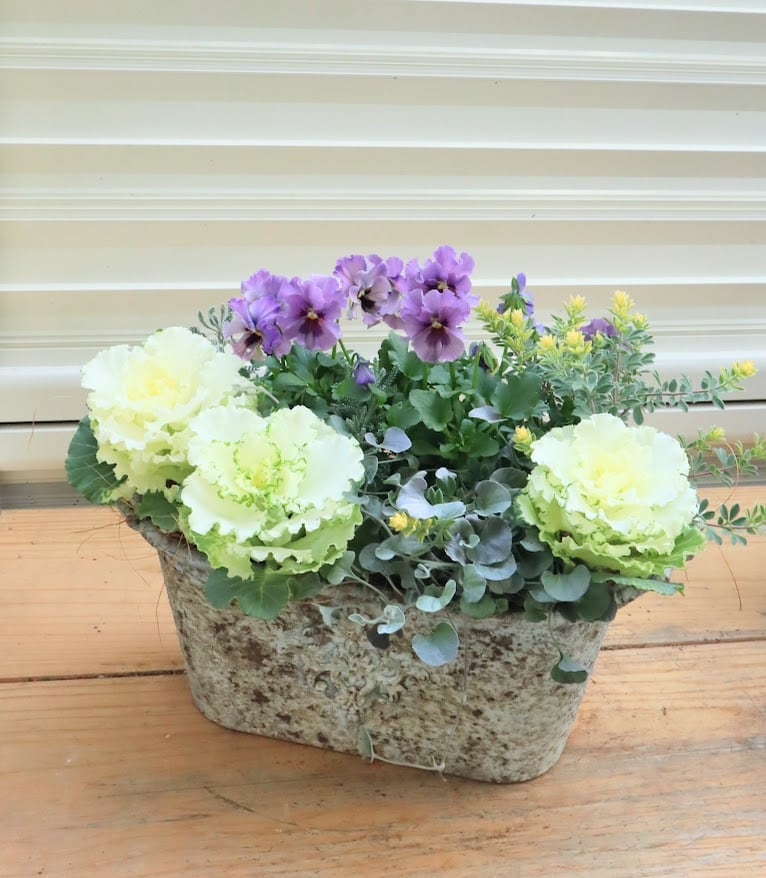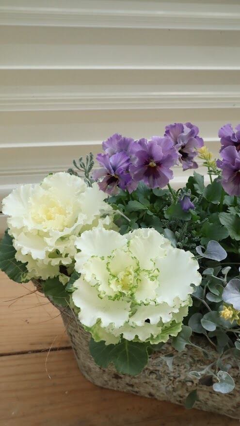 ビオラ『レディ』の繊細なニュアンスカラーと、純白のハボタン『ティファニーホワイト』を主役にした、冬の庭を彩るエレガントな一鉢です。サントリナ『雪のサンゴ礁』とディコンドラ『シルバーフォール』のシルバーリーフに、ロータスブリムストーンの柔らかなイエローが重なり、幻想的な雰囲気です。