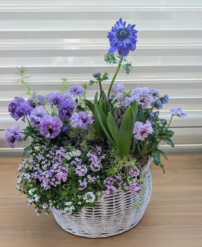 やわらかなラベンダーブルーが重なり合う、春らしさたっぷりの爽やか寄せ植え。