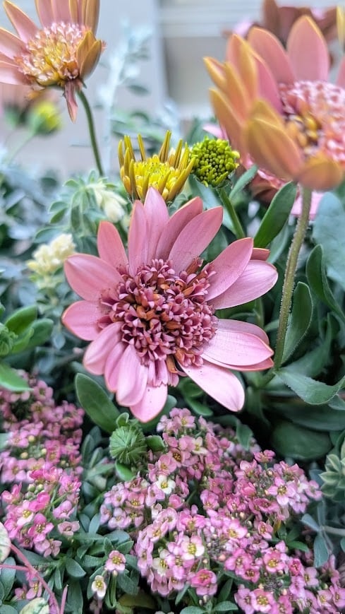 オステオスペルマム『桜子』の上品なピンクがふんわりと咲き、春らしい明るさを添えてくれます。足元にはピンクのアリッサムをたっぷりと合わせ、やわらかなグラデーションになるように仕立てました。