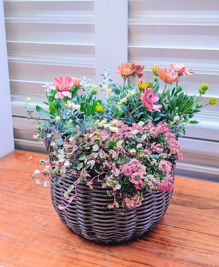 バスケット鉢なので、そのまま飾るだけで玄関やベランダがふんわり春の雰囲気に。