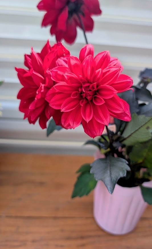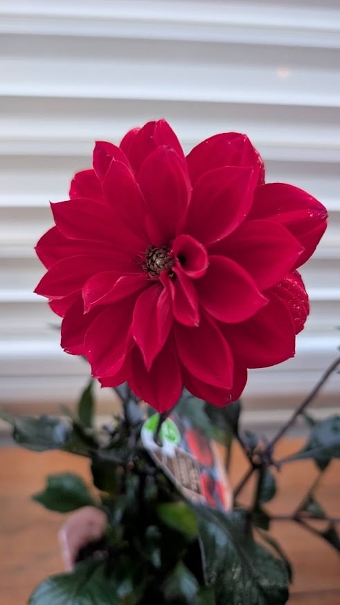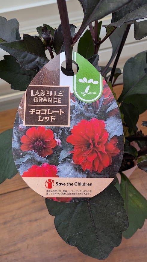 情熱的な深いレッドの花びらと、重厚感のある銅葉のコントラストが非常に美しいダリアです。
