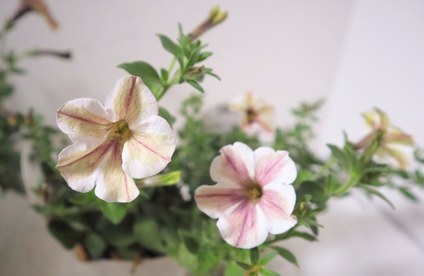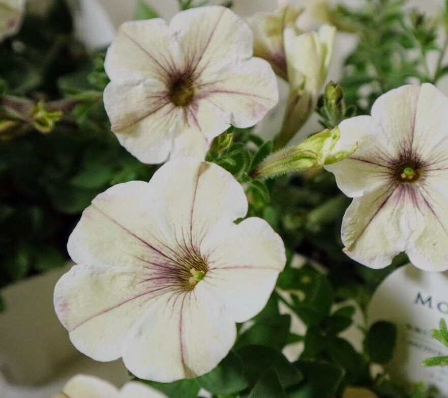 花径は5〜6cmほどで、白い花弁に薄くボルドー色の模様が入った何とも言えない可愛らしさと落ち着いた印象のあるペチュニアです♡アンティークな色味がとても素敵です。一重咲きですが、お花が大きくボリューム満点です!