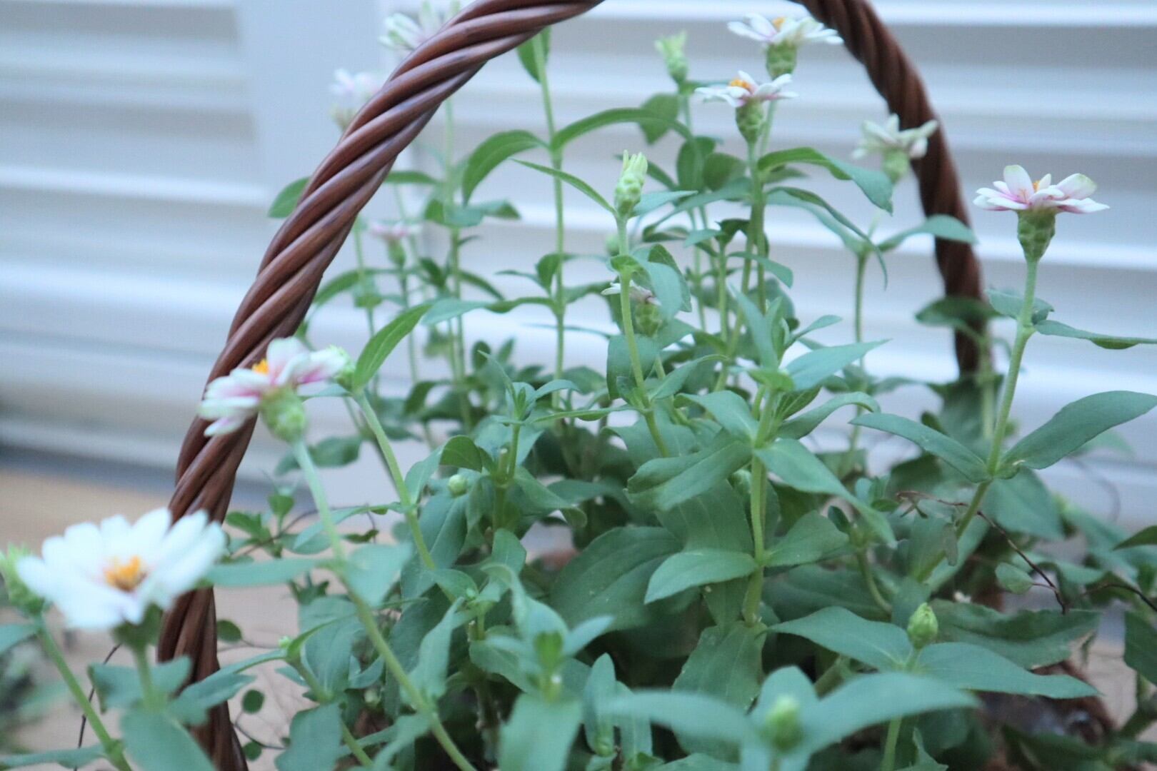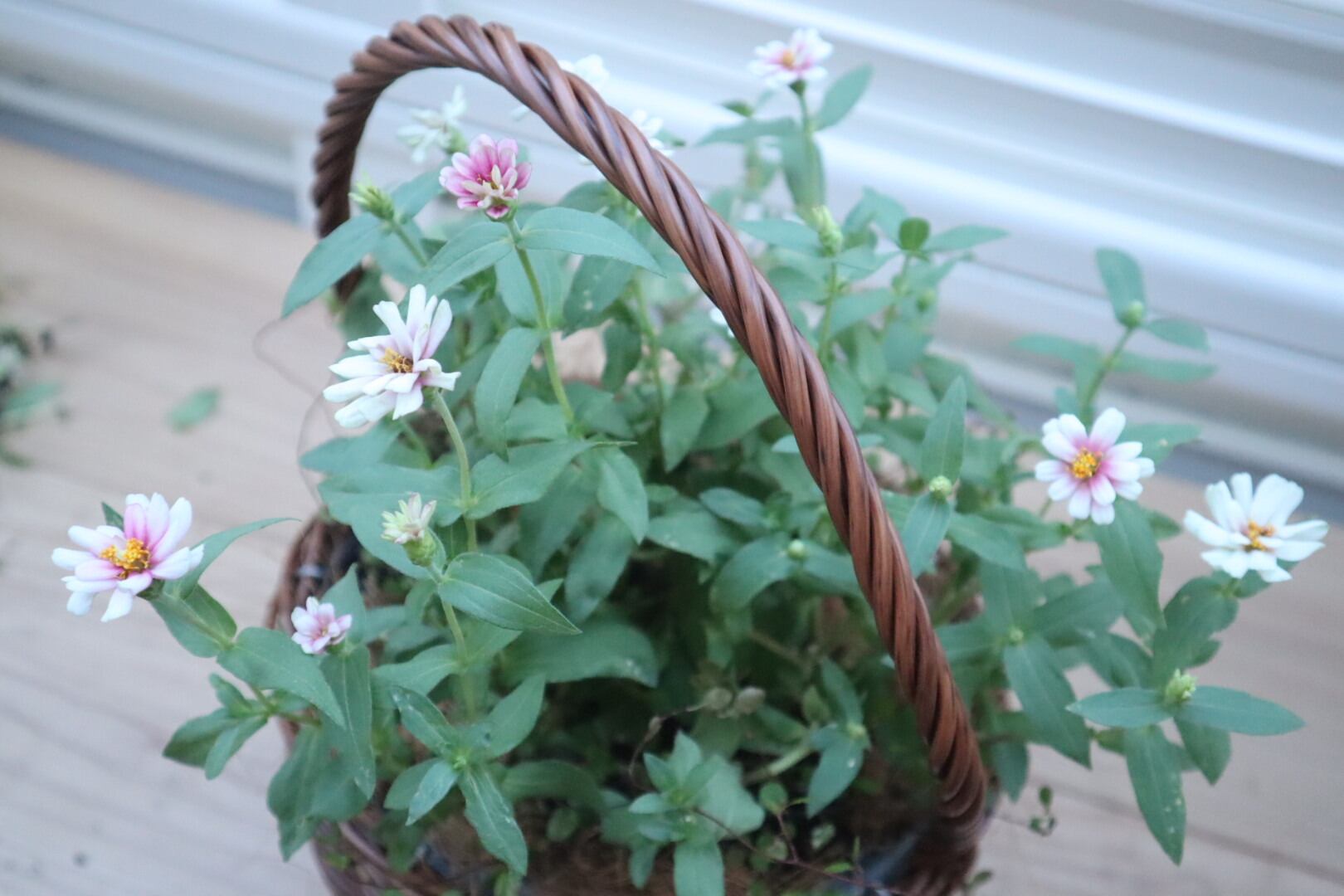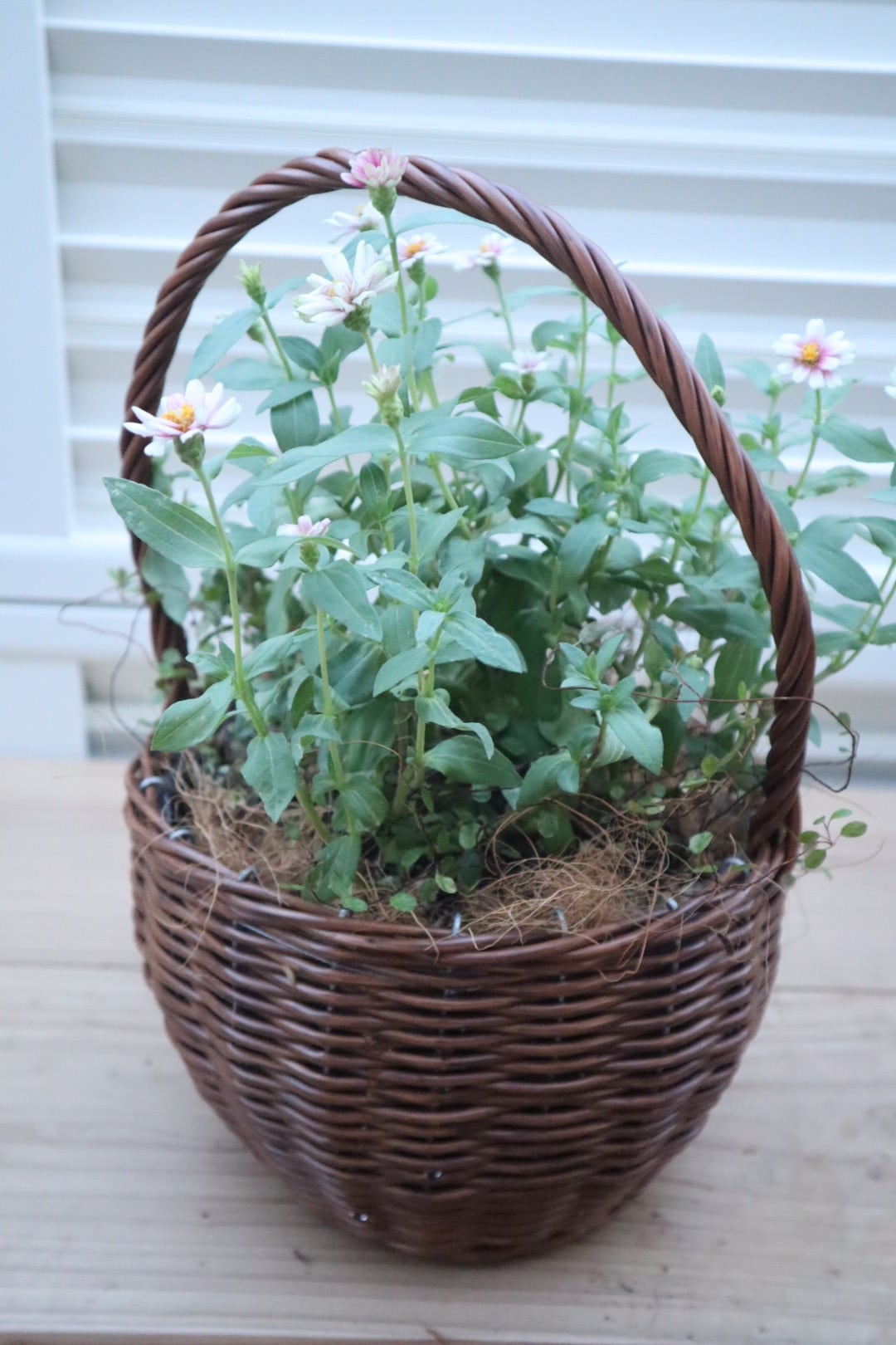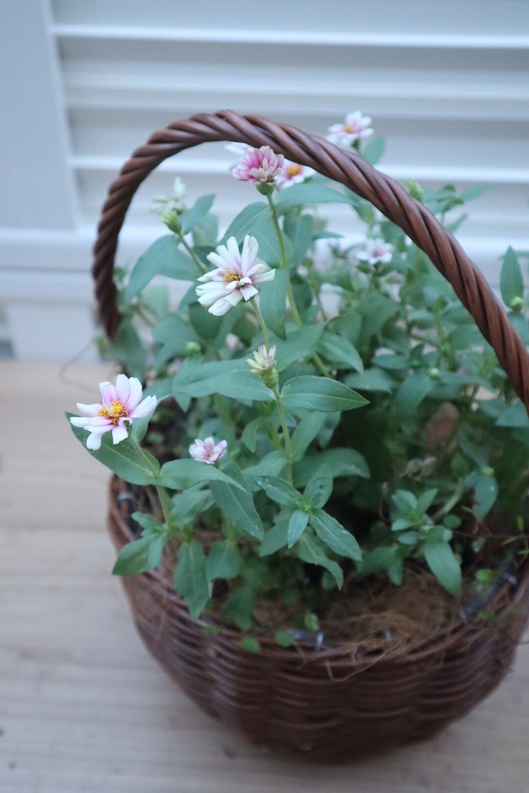 ラタン(籐)のブラウンバスケットに斑入りワイヤープランツがさりげなく寄り添って、ジニアの華やかな花色を引き立てています。