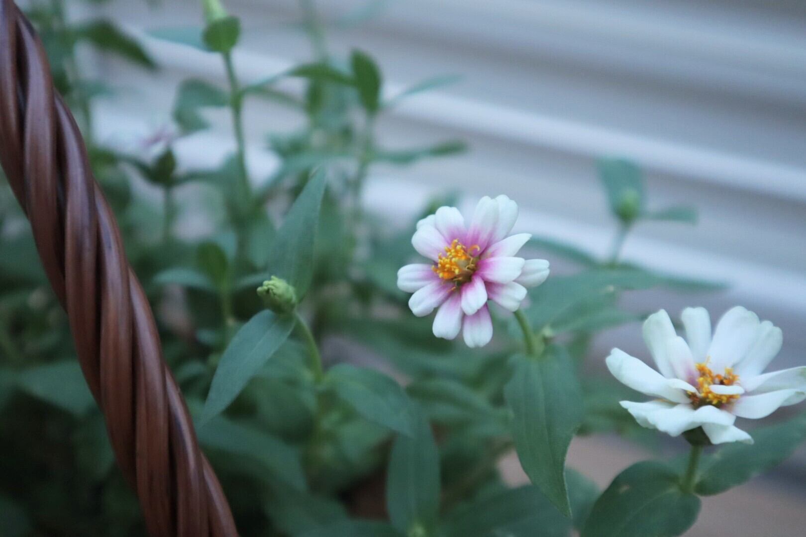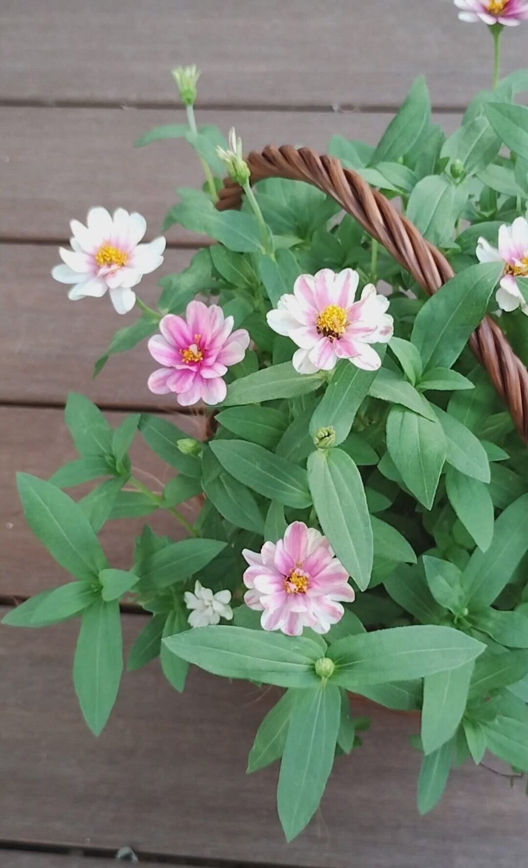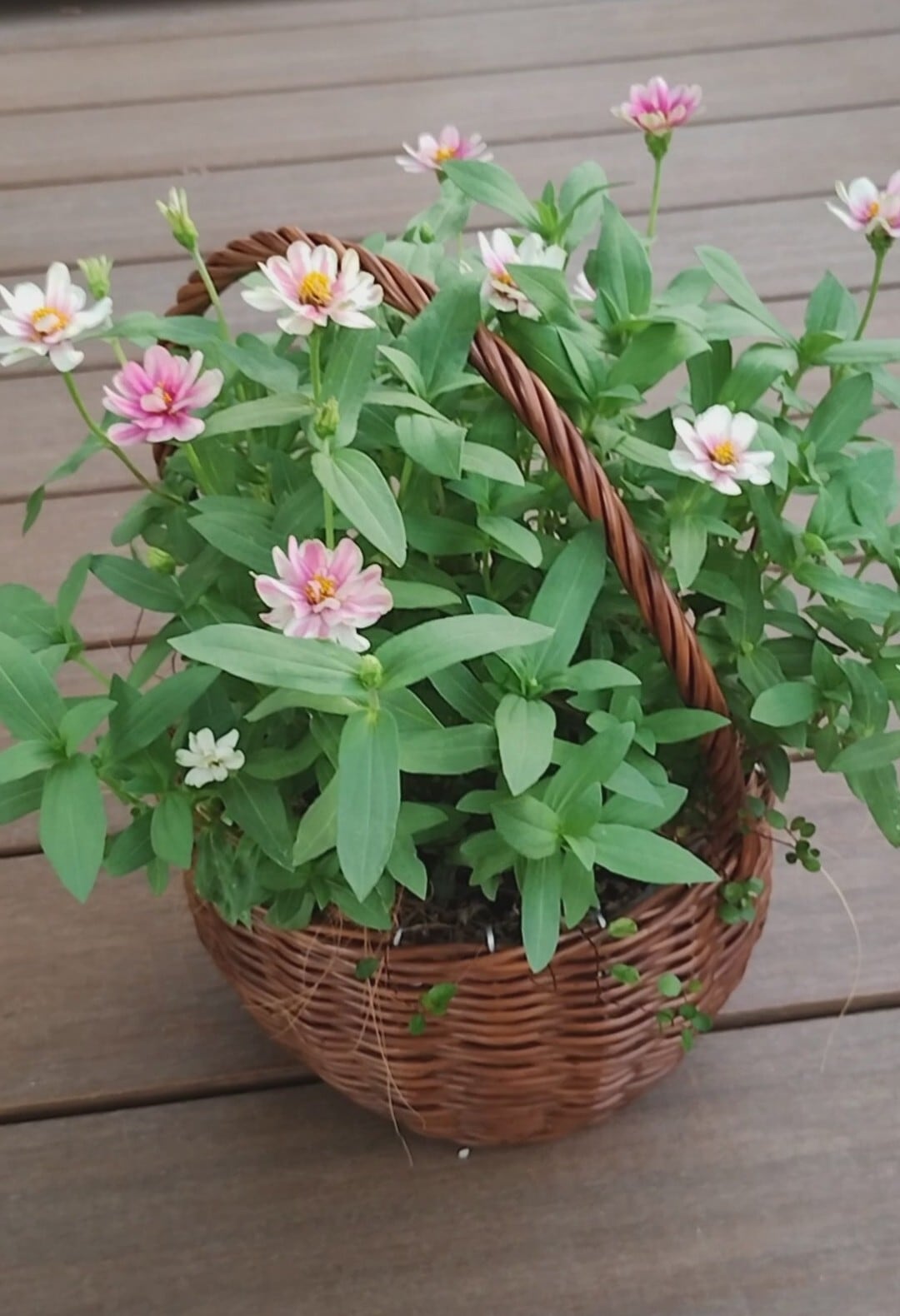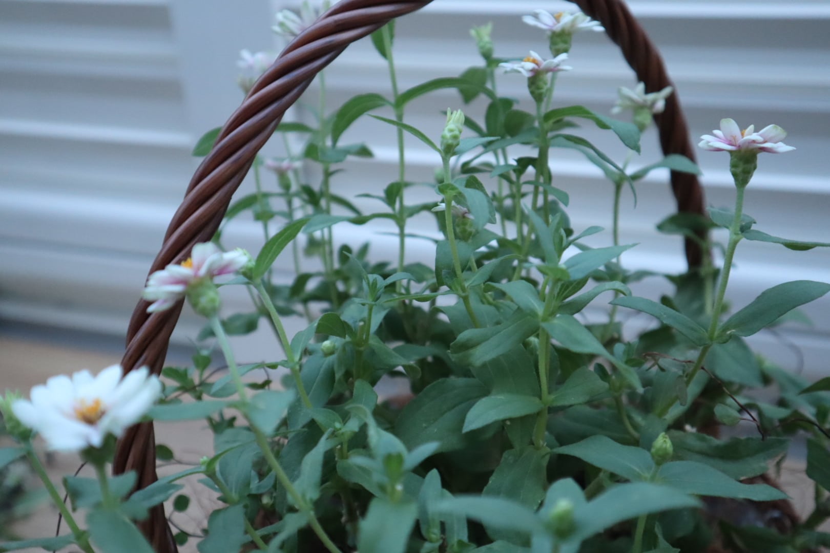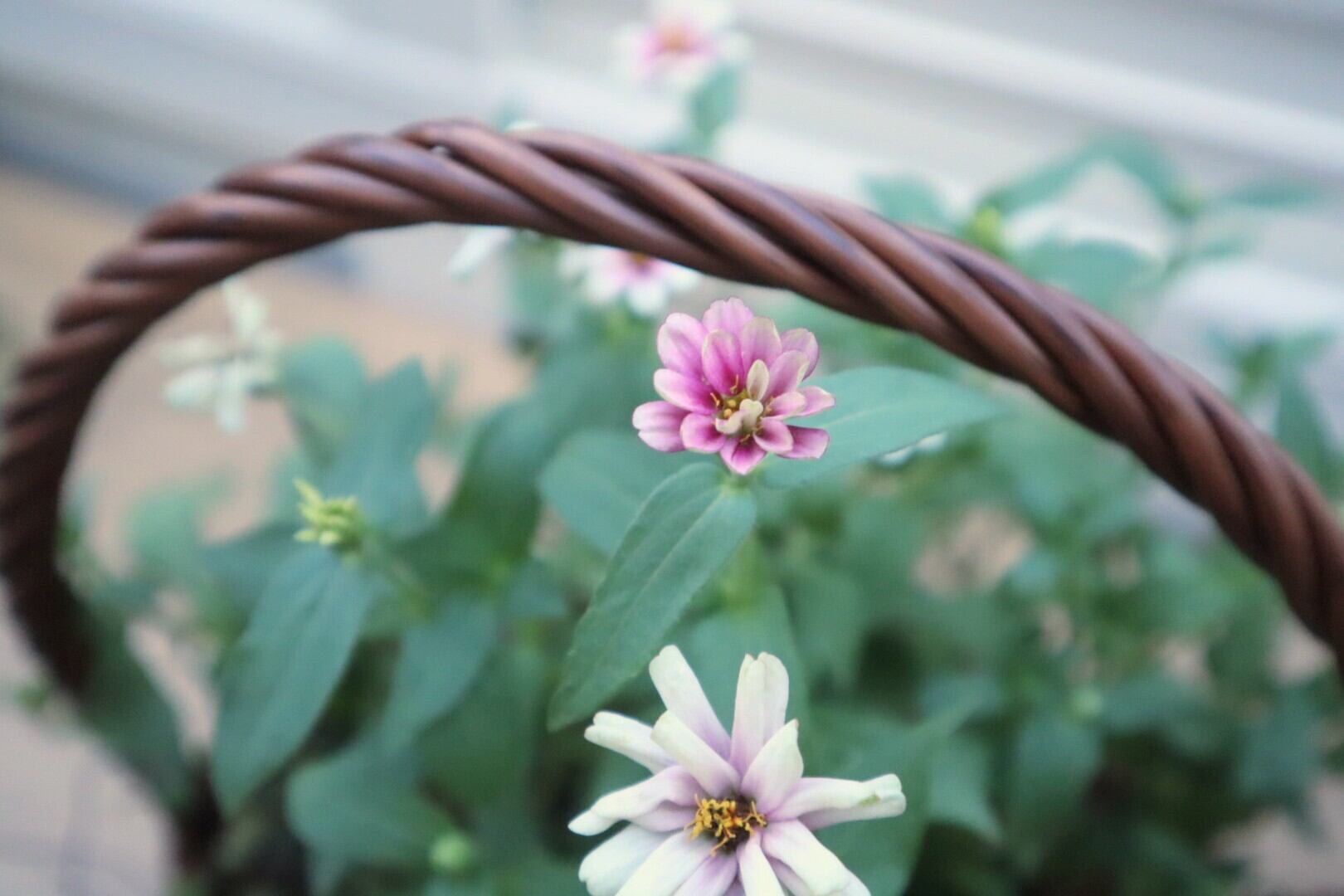 ラタン(籐)のブラウンバスケットに斑入りワイヤープランツがさりげなく寄り添って、ジニアの華やかな花色を引き立てています。